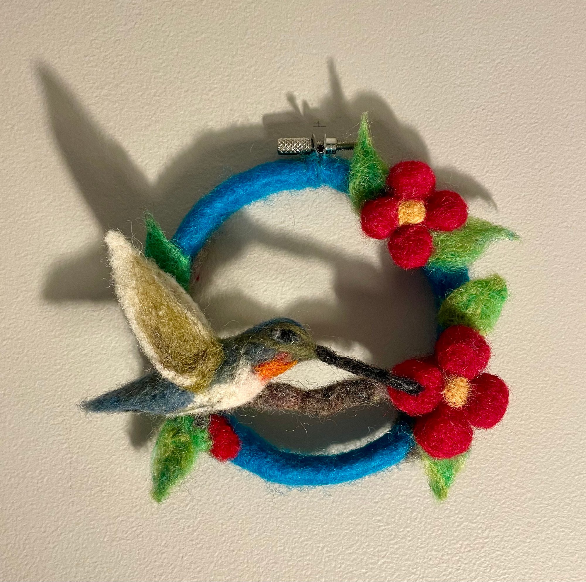 Hand felted, three dimensional, hummingbird and flowers on small hoop.